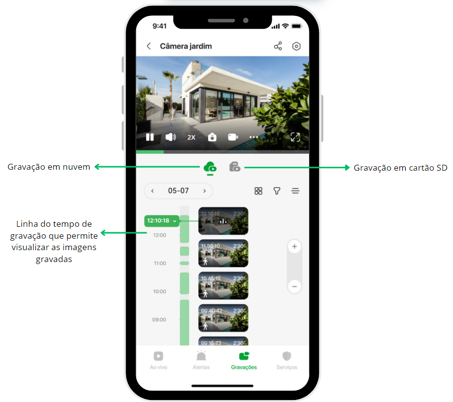 - Imagens salvas mesmo que algo ocorra com a câmera (queda, vandalismo ou furto);