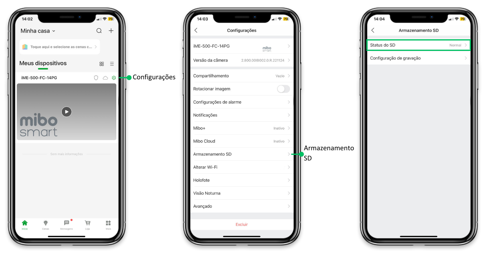 Verifique onde fica a entrada de cartão Micro-SD da sua câmera, insira o cartão e assegure que ao encaixar você ouviu um clique. Para verificar se seu cartão micro-SD foi reconhecido, no aplicativo clique no ícone encontrado ao lado direito do nome da sua câmera, na tela Home, em seguida Armazenamento SD e verifique o campo Status do SD . Caso o status não esteja Normal, efetue a formatação do cartão através do próprio aplicativo Mibo Smart.